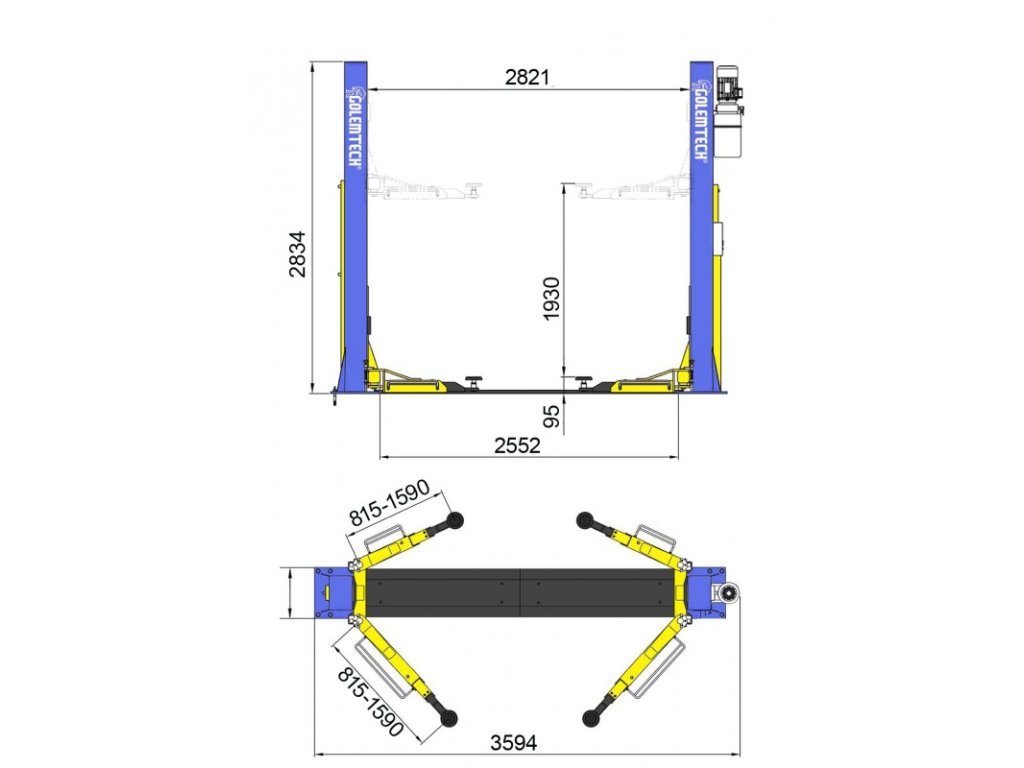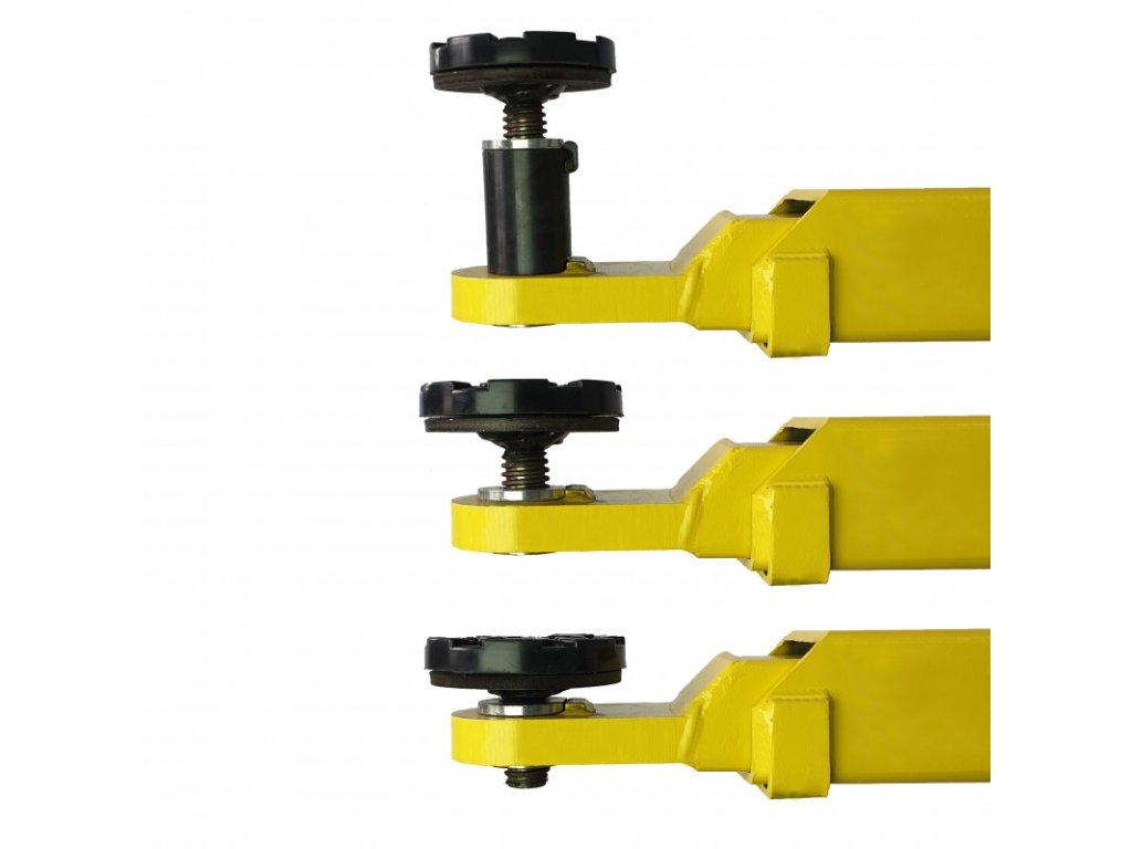 Model má variabilně nastavitelná třídílná symetrická s automatickou aretací polohy. Snadno tak lze dosáhnout zvedací body i u velkých automobilů (dlouhé modely dodávek atd.). Konce nosných ramen jsou opatřené výškově nastavitelnými patkami. Patky mají vrchní plochu ze speciální pryže s optimálním designem, díky čemuž nehrozí při normálním provozu riziko poničení zdvihaného auta. Ve zvolené pracovní poloze jsou pojezdové bloky s nosnými rameny aretovány bezpečnostními západkami, takže hydraulika zvedáku není zbytečně zatěžována a neničí se.