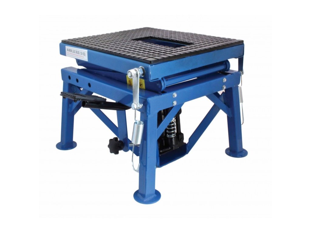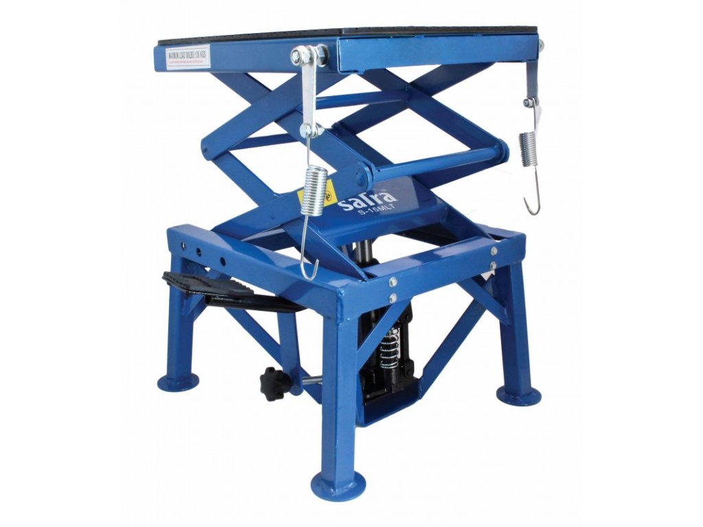 Hydraulický nůžkový motocyklový zvedák s nosností 136 kg, ovládání pedálem, max. výška 905 mm – SATRA S-15MLT.