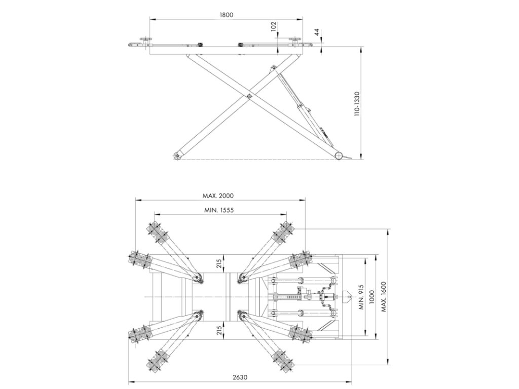 Nůžkový mechanismus pojíždí při zdvihání či spouštění svou volnou stranou přímo po podlaze (tento systém vyžaduje rovnou betonovou podlahu). Zvedák je vybaven plošinami s prodlouženými rameny, které zajišťují rovnoměrné rozložení váhy automobilu při zvedání.